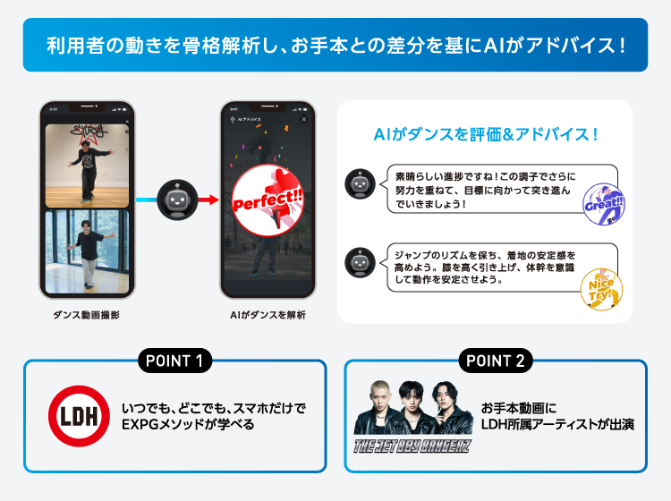 「AI DANCE LAB Supported by SoftBank」は、スタジオでダンスを学ぶ生徒や、これからダンスを習いたい方に向けて新たな学習機会を提供するサービスです。利用者がスマホで自身のダンス動画を撮影すると、骨格推定により関節の座標データを抽出し、お手本動画との動きの差分を解析します。解析結果に基づき、上達に向けた具体的なアドバイスを生成AIがテキスト形式で提示します。お手本動画には、LDH所属のアーティストなど、第一線で活躍するプロフェッショナルが出演します。また、生成AIによるアドバイスは、LDHが監修した指導データを基に生成されるため、実践的で質の高いフィードバックを実現します。